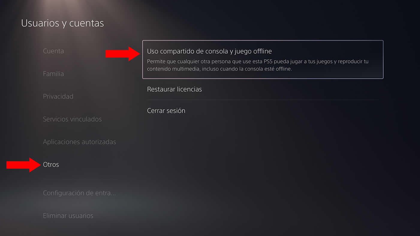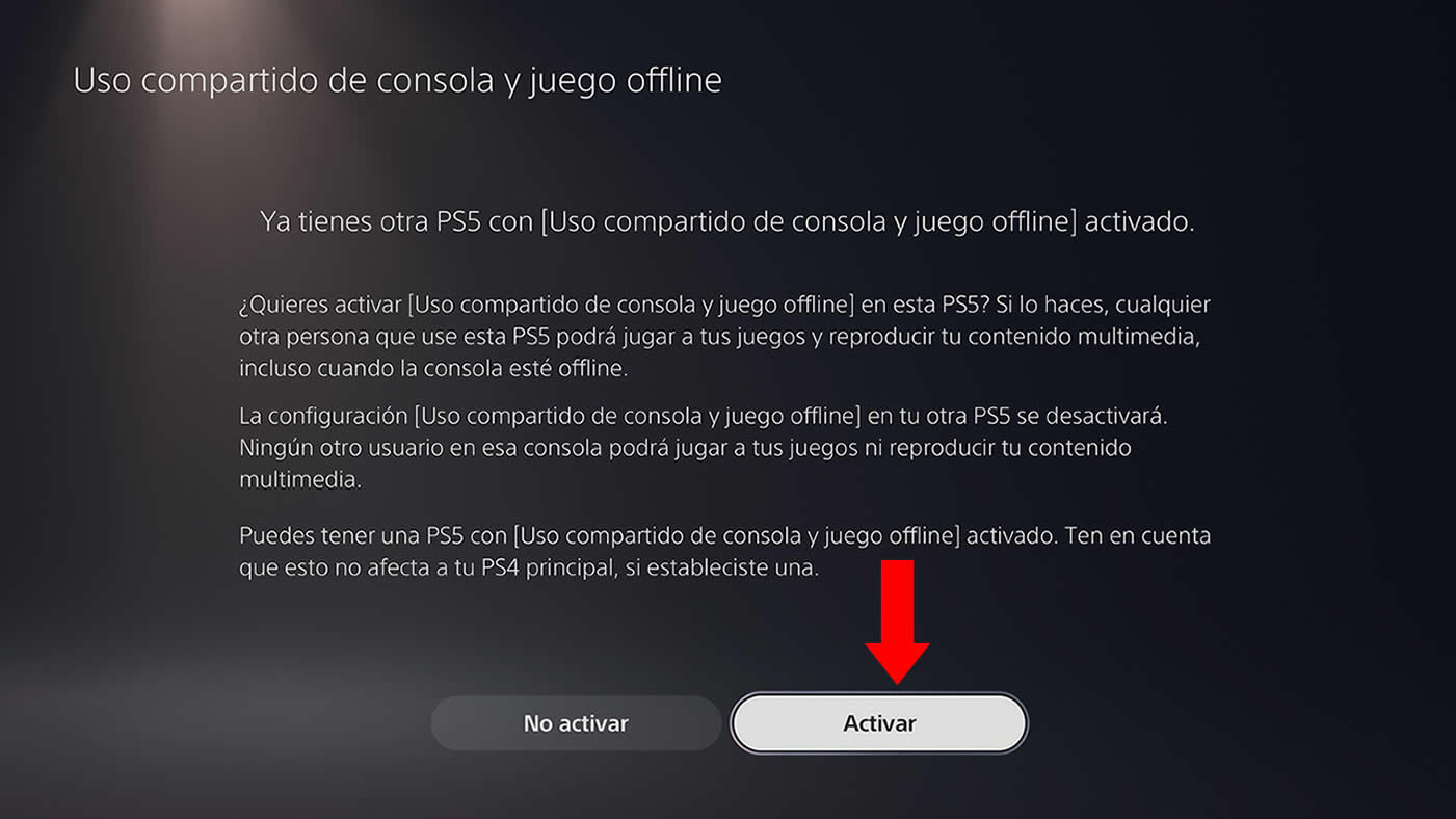 Configuración > Usuarios y cuentas > Otros > Uso compartido de consola y juego offline - Una vez en esa pantalla, hacé click en el botón Activar